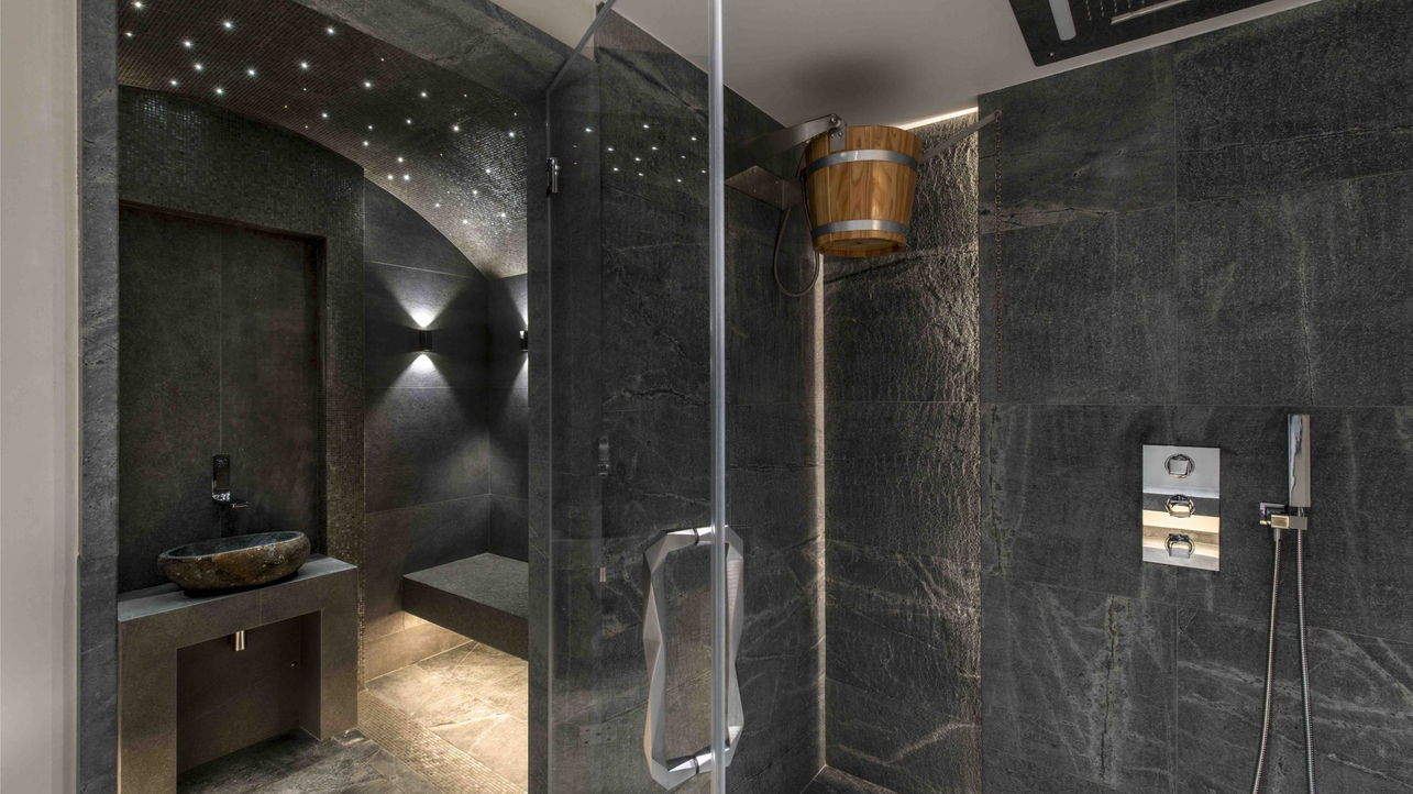 The chalet’s private spa offers a sanctuary of wellness, complete with an indoor pool, jacuzzi, sauna, hammam, and massage room. For beauty and fitness, a dedicated wellness suite includes a hairdresser space, gym, and beauty area.