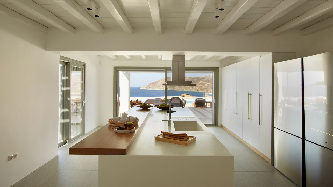 At the heart of the villa is a spectacular infinity pool that seems to float above the sea, surrounded by minimalist Cycladic architecture and sleek modern design. Multiple gourmet kitchens, elegant living areas, and refined common spaces make the villa equally suited for large group stays or private events—from weddings and celebrations to wellness retreats and corporate escapes.